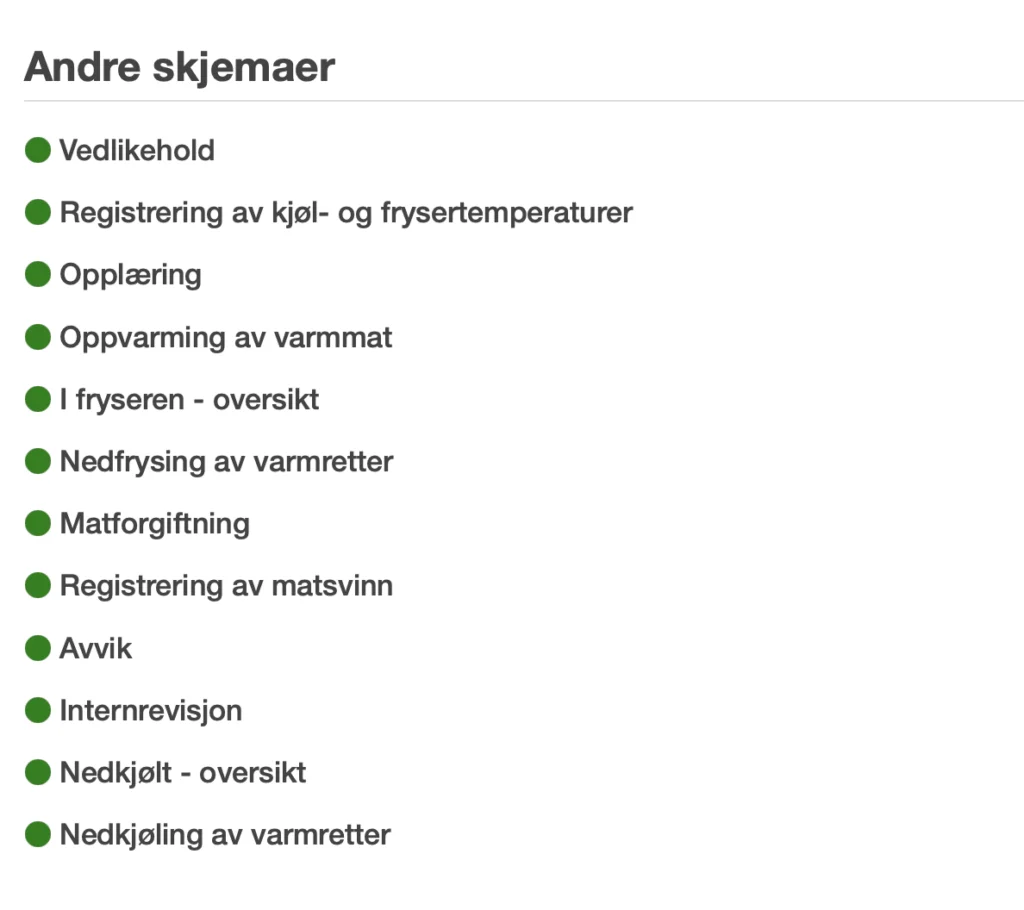 Egenkontroll har et stort utvalg av standard skjemaer og skal dekke alle dine daglige behov. Vi streber etter å levere et mest mulig omfattende system og har et bredere utvalg av skjemaer enn noe annet system på markedet. Men dersom vi mot formodning skulle mangle et skjema så send oss en skisse av skjemaet, så lager vi det selvfølgelig for deg.