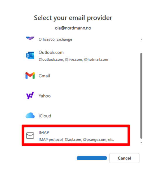 DU kan velge mellom IMAP eller PO/POP3 når du skals ette opp emailkontoen. Når du bruker IMAP så bli emailen ligende på serveren og du leser og jobber mot serveren. Dersom du bruker email på flere enheter (PC, telefon, lesebrett) så vil emailene dukke opp på alle enhetene. Ved bruk av POP/POP3 så vil all email lastes ned til klienten du bruker og slettes fra server. Vi anbefaler IMAP og vil vise deg oppsettet av IMAP videre. Det første du vil få spørsmål om i oppsettet av mail er valg av kontotype - velg her IMAP.