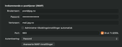 Neste valg er innkommende eposttjener (IMAP). Her skal brukernavnet ditt være hele emailadressen din som [email protected]. Legg deretter inn passordet du har fått tilsendt eller satt selv. Vertsnavn eller servernavn er mail.jpg.no. Port er viktig å sette. Ofte kan dette være satt automatisk i så fall må du overstyre den og velge port 993. SIkkerhetsnivå må også settes vi bruker TLS/SSL på vår server. Autentisering er passord. Trykk deretter lagre. Konfigurasjonsvinduet kan se forskjellig ut på ulike mailklienter men innholdet er det samme og du må definere brukernavn, passord, vertsnavn(eller IMAP server), port, sikkerhetsnivå og autentiseringsmetode.